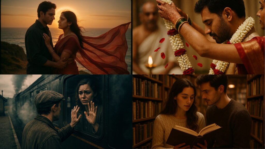 Inside a vintage bookshop with warm tungsten light. The woman holds an open novel; the man leans in quietly, eyes meeting through floating dust particles. Shallow depth of field, wooden shelves, cozy texture.